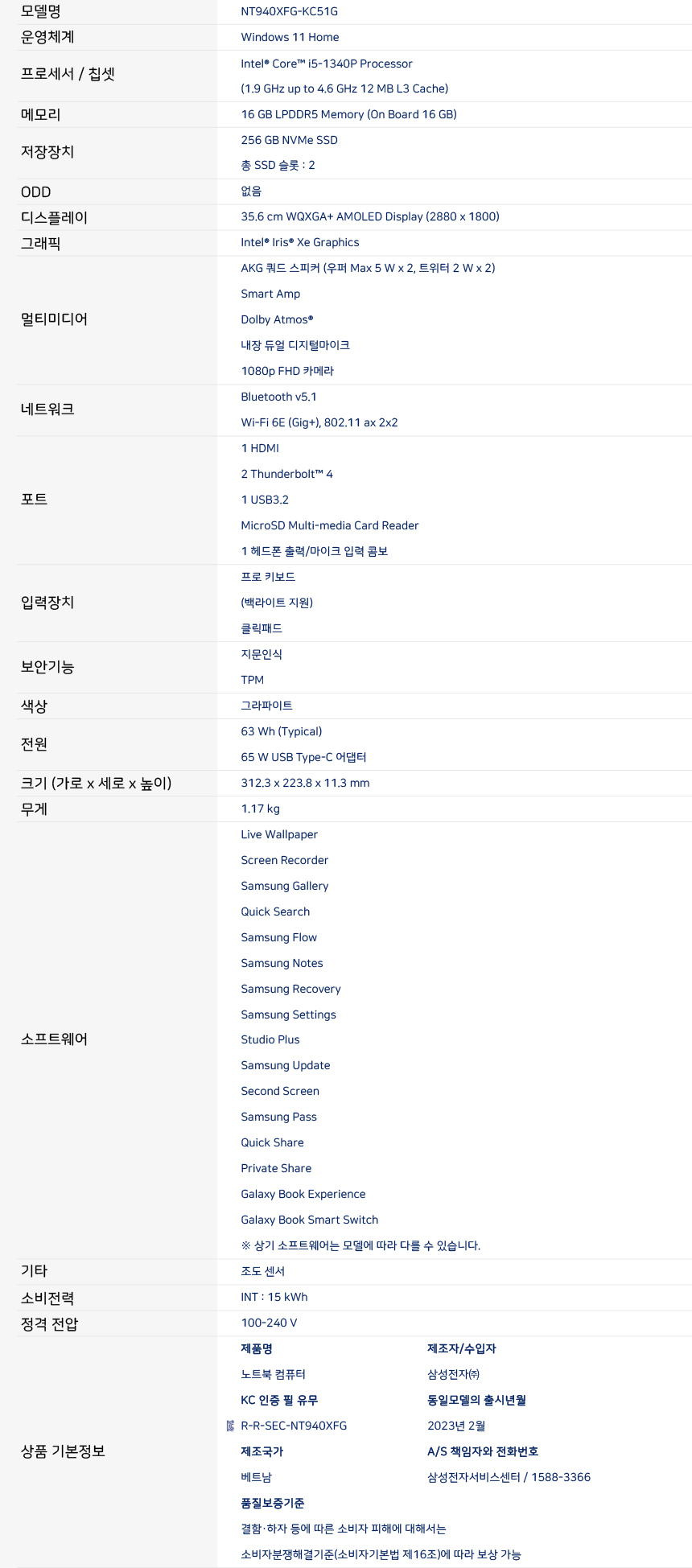 [삼성전자] 갤럭시북3 프로 NT940XFG-KC51G 그라파이트 (기본 제품)