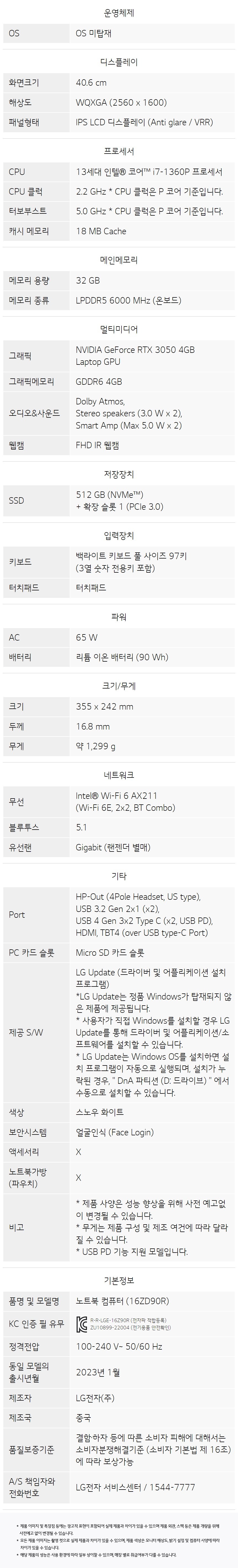 [LG전자] 2023 그램16 16ZD90R-EX7VK (기존 제품)