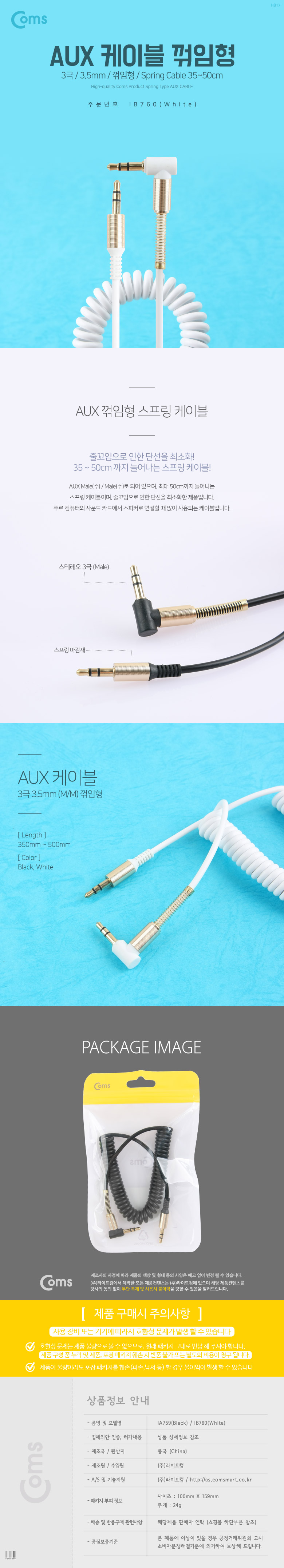 [Coms] 컴스 AUX 케이블(3극) M/M IB760 (30~50cm, 화이트, 한쪽꺾임/스프링타입)