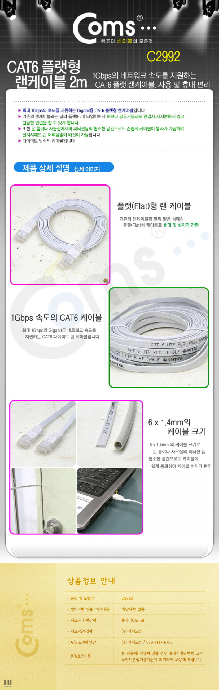 [Coms] 컴스 기가 플랫 랜케이블 CAT6 C2992 (2m, 1Gps, 다이렉트)
