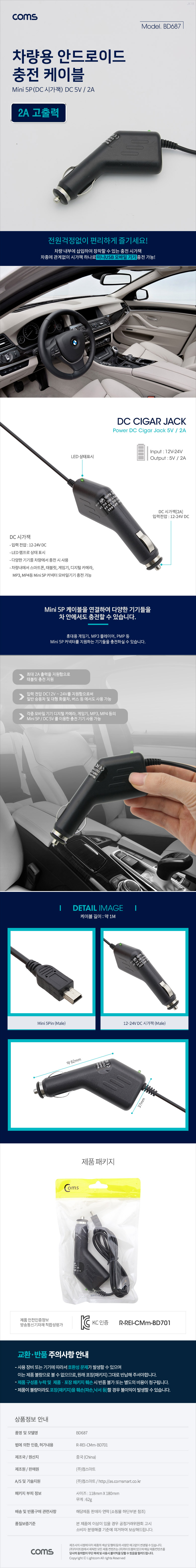 [Coms] 컴스 미니 5핀 차량용 충전 케이블 M/M BD687 (DC 5V/2A, 1m)