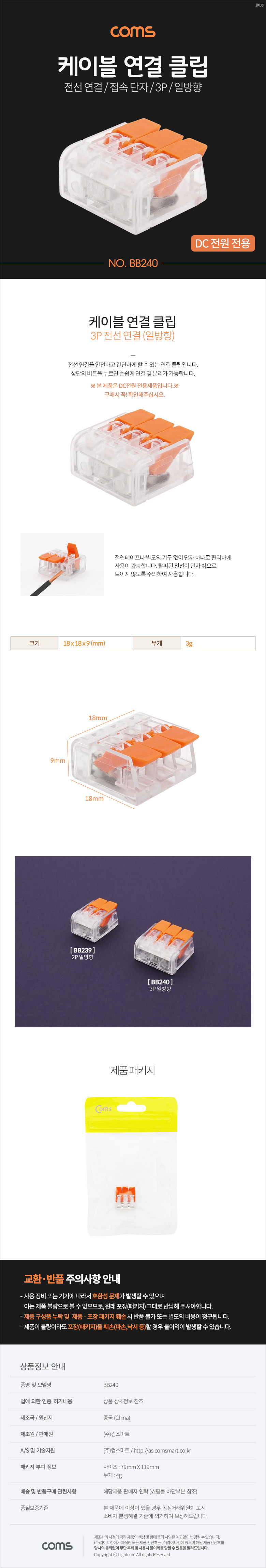 [Coms] 컴스 케이블 연결 클립 3핀 BB240 (18x18x9mm, 일방향, 전선 연결, 접속 단자)
