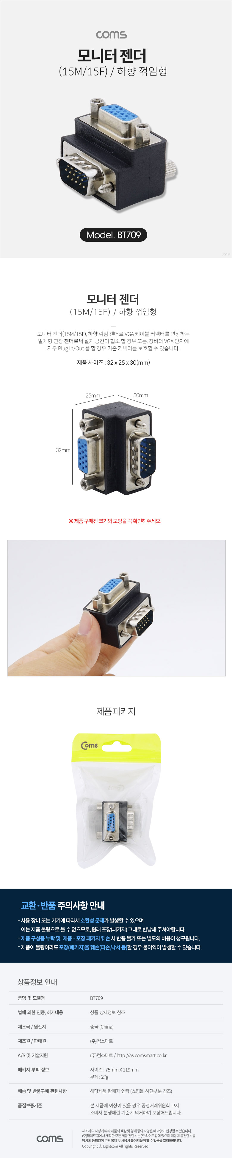 [Coms] 컴스 VGA 15핀 모니터 젠더 M/F BT709 (32x25x30mm, 하향꺾임)