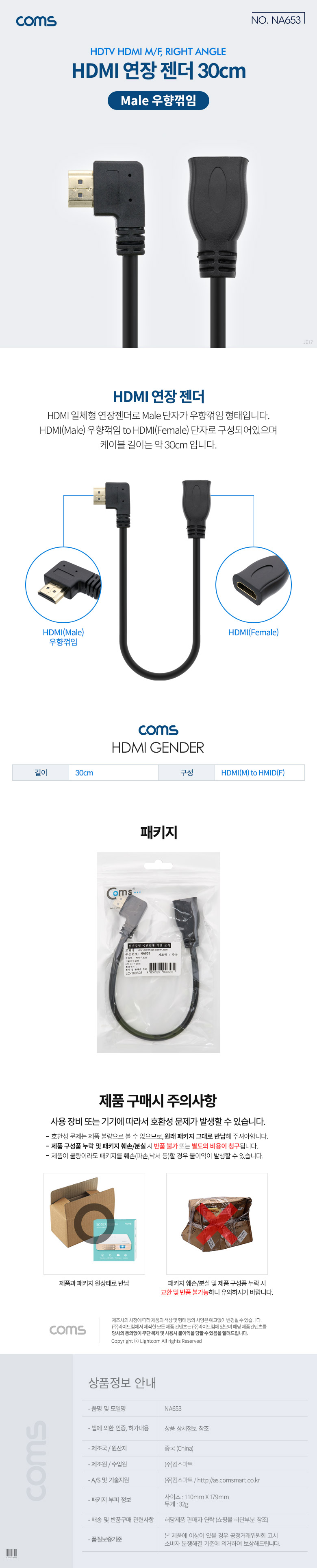 [Coms] 컴스 HDMI 연장 젠더 M/F NA653 (30cm, 블랙, M우향꺾임)