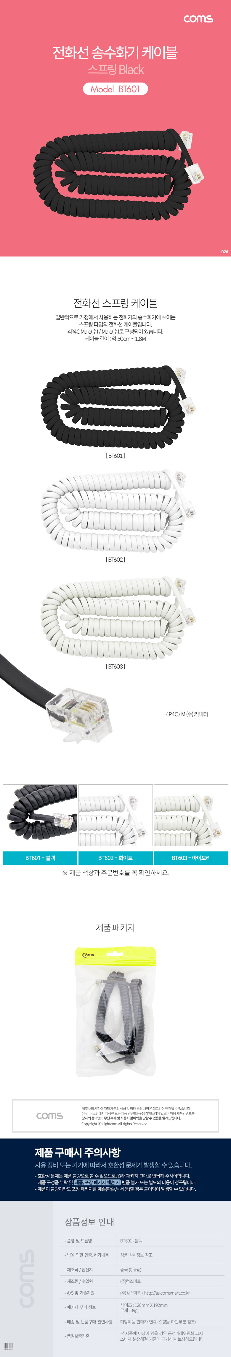 [Coms] 컴스 4P4C 전화선 송수화기 케이블 M/M BT601 (50~180cm/스프링, 블랙)