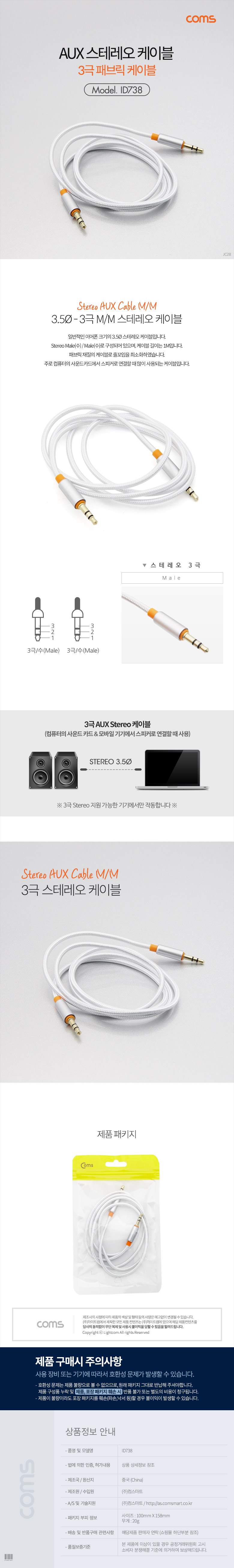 [Coms] 컴스 AUX 스테레오 3.5mm 3극 케이블 M/M ID738 (1m, 화이트, 패브릭)