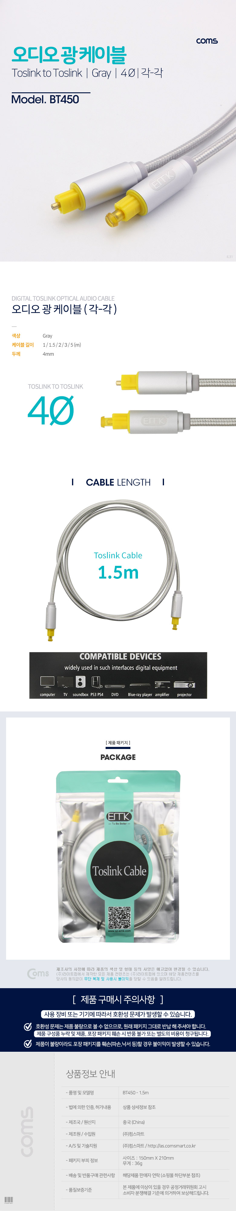 [Coms] 컴스 오디오 광 각/각 디지털 EMK 케이블 M/M BT450 (1.5m, 4Ø, 그레이)