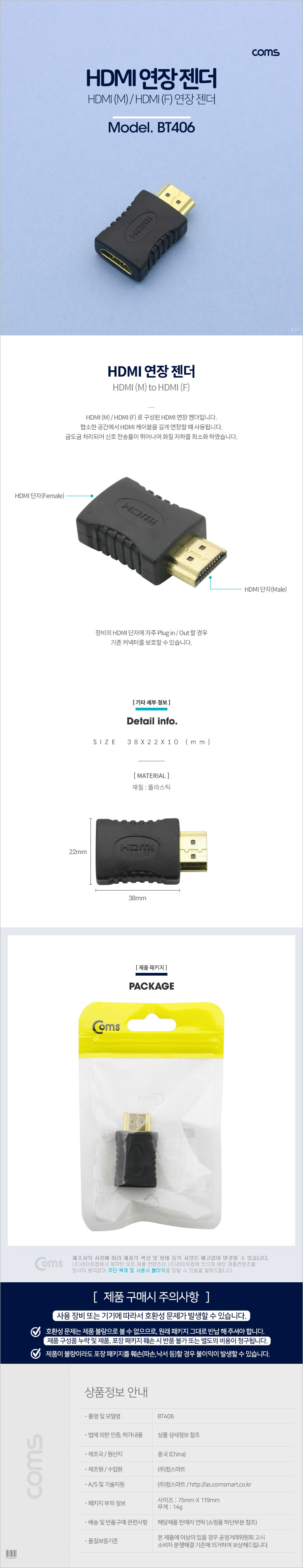 [Coms] 컴스 HDMI 연장 젠더 M/F BT406 (38x22x10mm, 블랙)