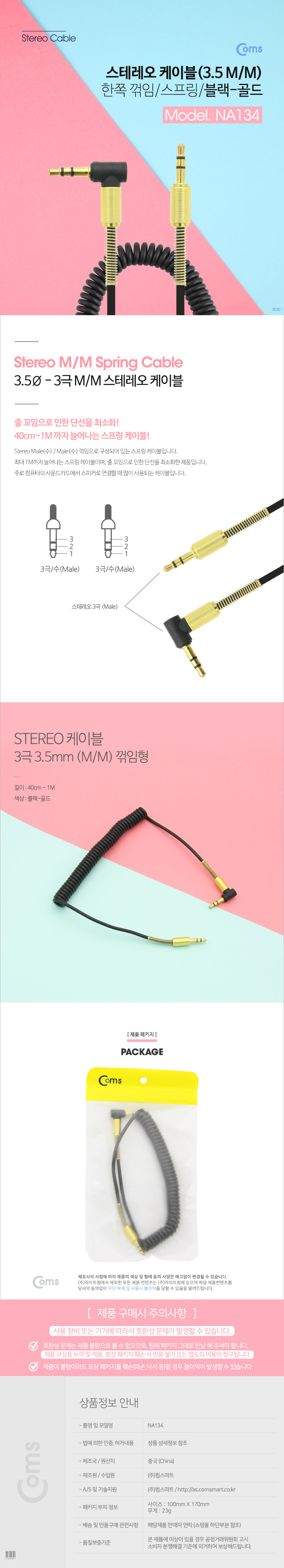 [Coms] 컴스 스테레오 3.5mm 3극 케이블 M/M NA134 (0.4~1.0m, 블랙/골드, 스프링, 한쪽꺾임)