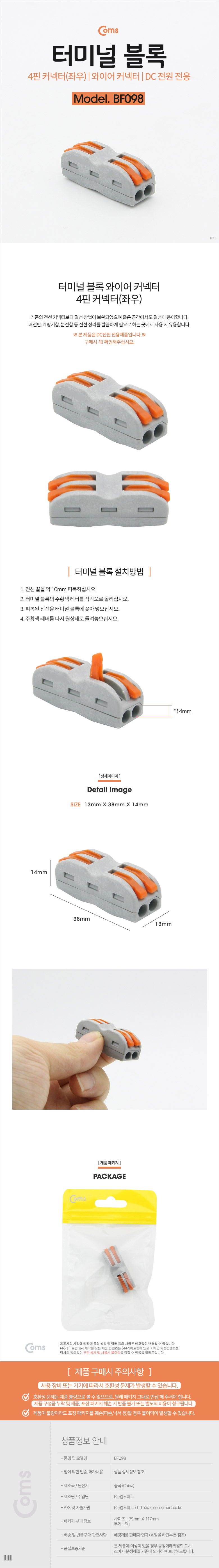 [Coms] 컴스 터미널 블록 4핀(좌2핀+우2핀) 와이어 커넥터 BF098 (13x38x14mm, 툴리스, 전선정리)