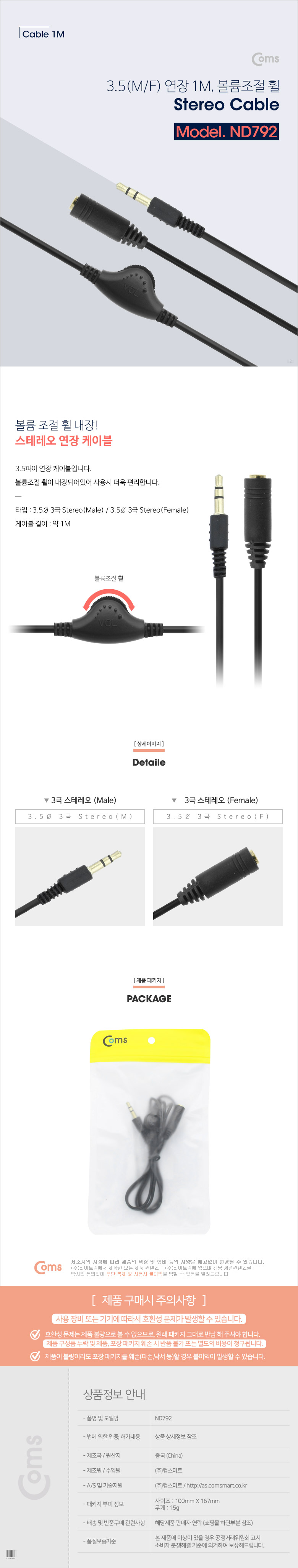 [Coms] 컴스 스테레오 3.5mm 3극 케이블 M/M ND792 (1.0m, 블랙, 볼륨조절 휠)