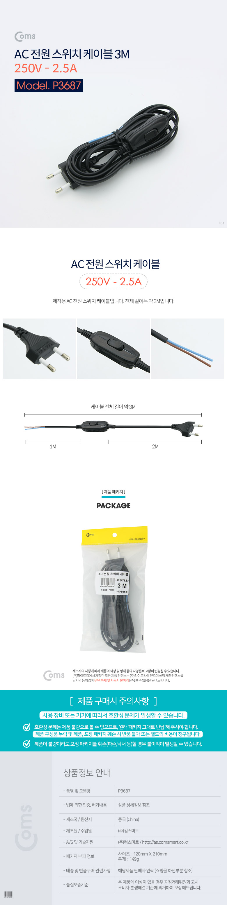 [Coms] 컴스 AC 전원 스위치 케이블 P3687 (3m/블랙, 250V/2.5A, ON/OFF, 제작용)
