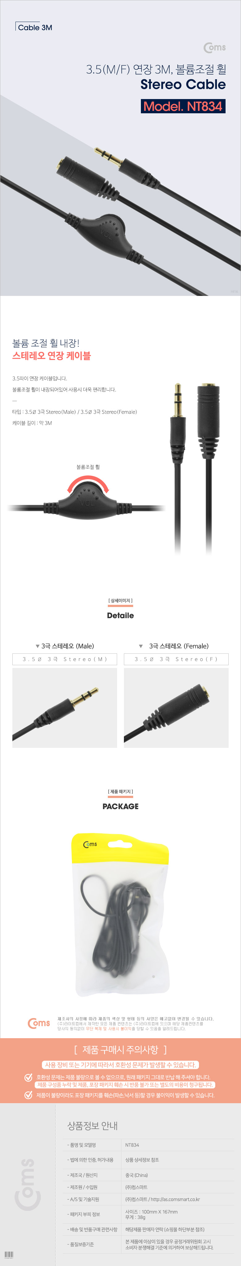 [Coms] 컴스 스테레오 3.5mm 3극 연장 케이블 M/F NT834 (3.0m, 블랙, 볼륨조절 휠)
