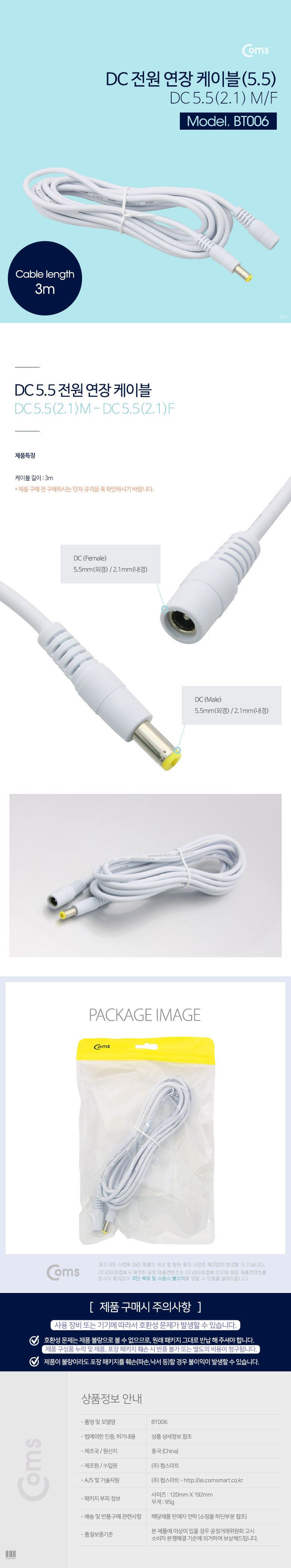 [Coms] 컴스 DC 5.5/2.1mm 전원 연장 케이블 M/F BT006 (3.0m, 화이트, 옐로우팁)