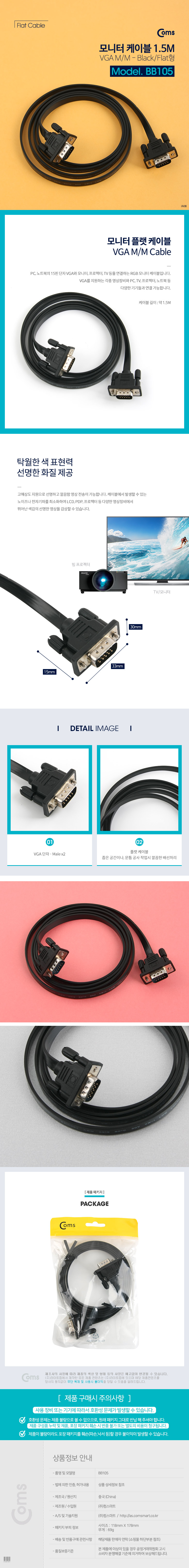 [Coms] 컴스 VGA 15핀 모니터 케이블 M/M BB105 (1.5m/블랙, 플랫)