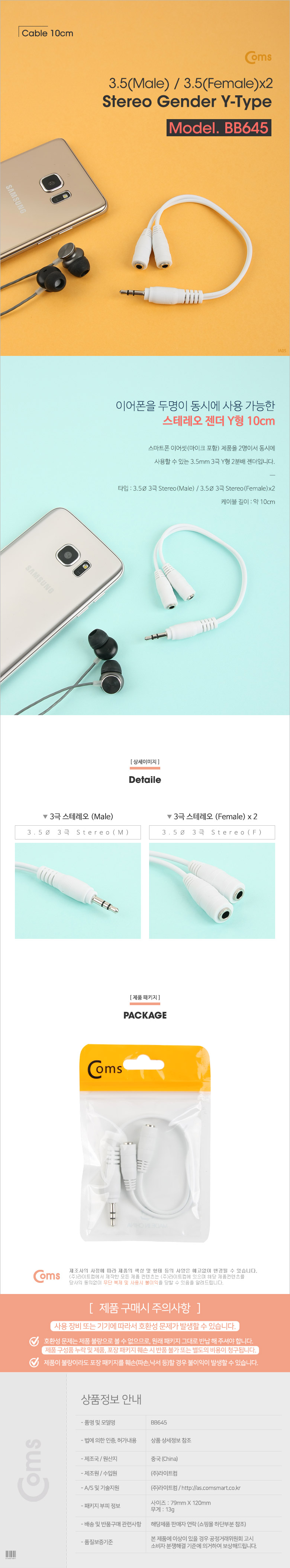 [Coms] 컴스 스테레오 3.5mm 3극 Y형 젠더 M/F BB645 (10cm, 화이트, 2분배)