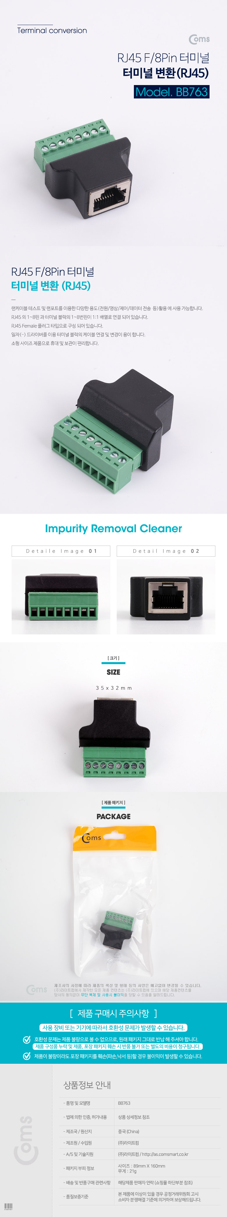[Coms] 컴스 RJ45 F/터미널블록 8핀 변환 젠더 BB763 (35x32mm, 블랙+그린)