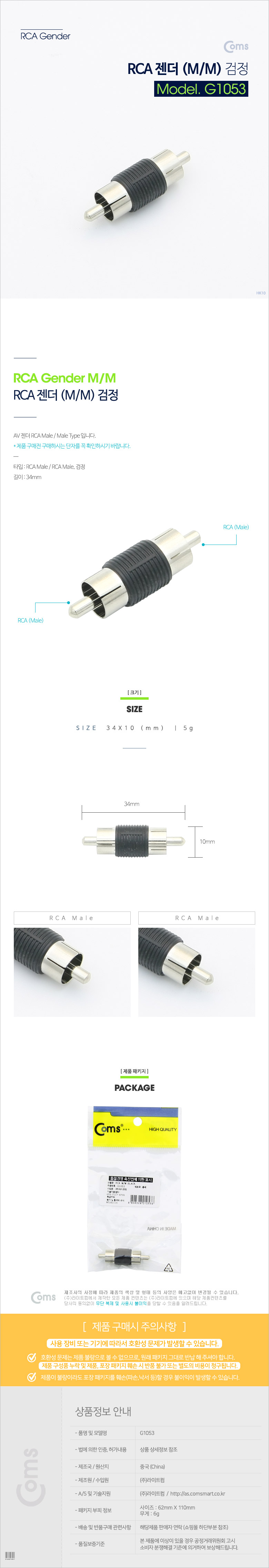 [Coms] 컴스 RCA 젠더 M/M G1053 (34x10mm/블랙)