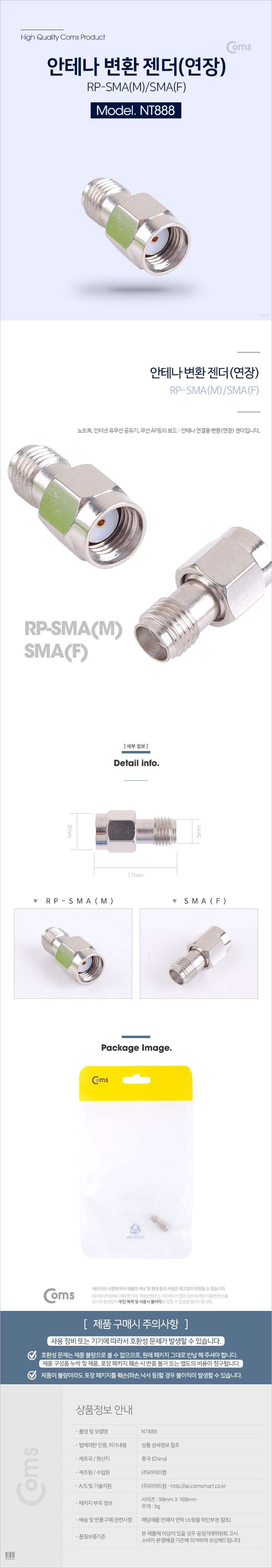 [Coms] 컴스 RP-SAM to SAM 안테나 연장 젠더 M/F NT888 (메탈, 8x17mm)