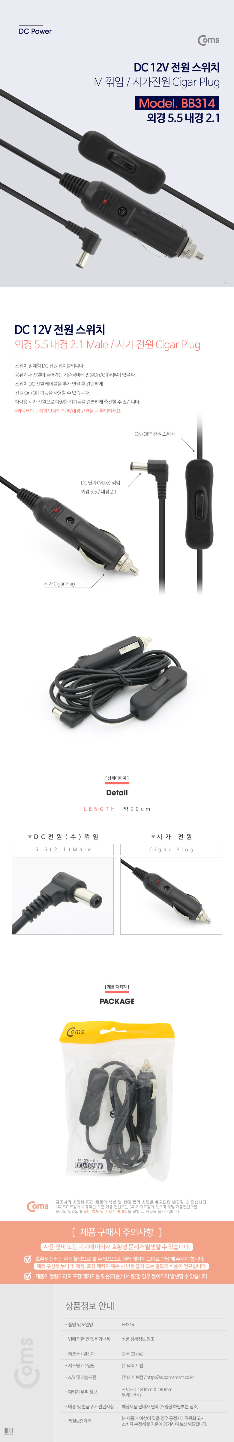 [Coms] 컴스 DC 전원/시가잭 스위치 케이블 M/M (DC 5.5/2.1mm, DC꺾임)