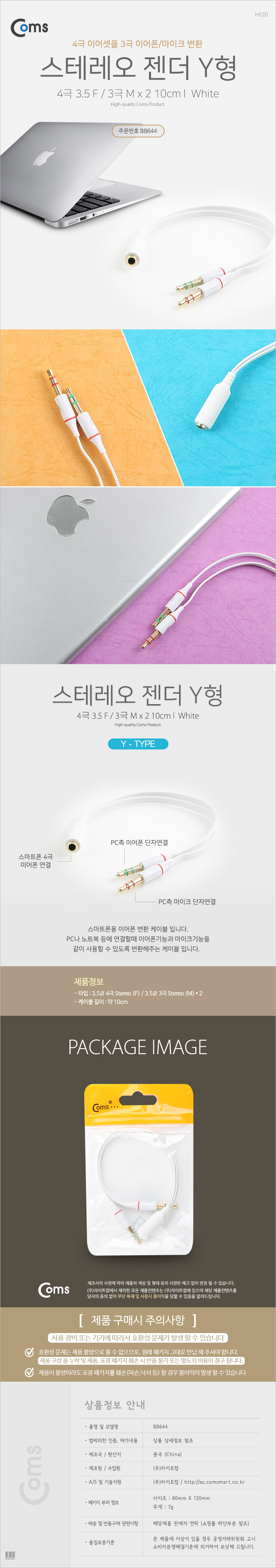 [Coms] 컴스 스테레오 3.5mm 3극 Y형 젠더 M/F BB644 (10cm, 화이트)