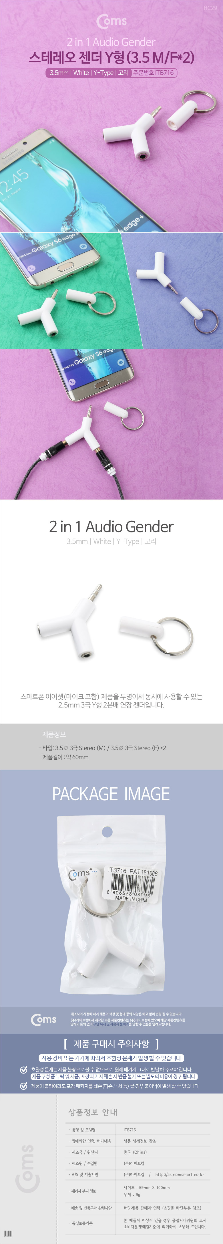[Coms] 컴스 스테레오 3.5mm 3극 Y형 젠더 M/F ITB716 (60cm, 화이트, 고리타입, 2분배)