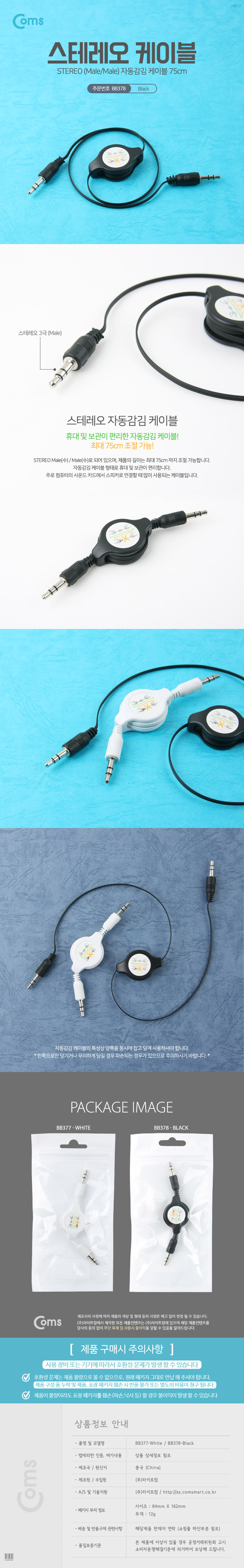 [Coms] 컴스 스테레오 3극 자동감김 케이블 M/M BB378 (75cm, 블랙, 플랫)