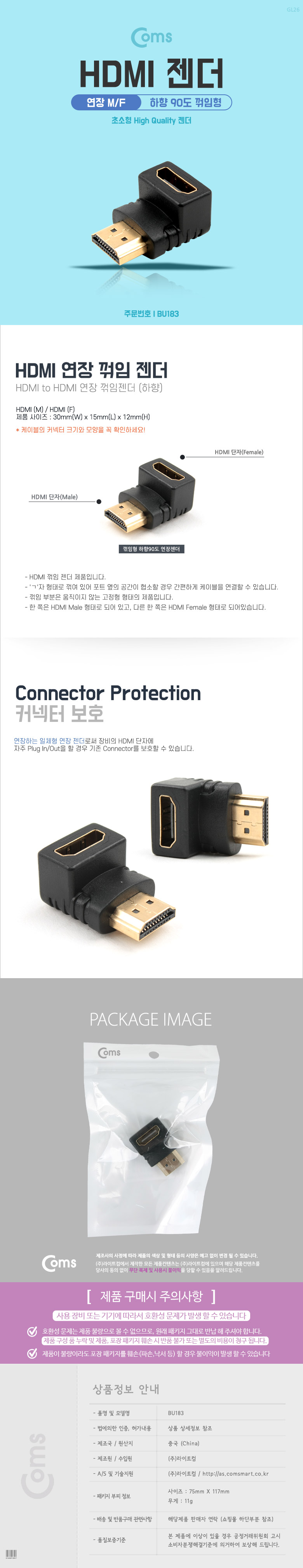 [Coms] 컴스 HDMI 연장 젠더 M/F BU183 (30x15x12mm, 블랙, 하향90도꺾임)