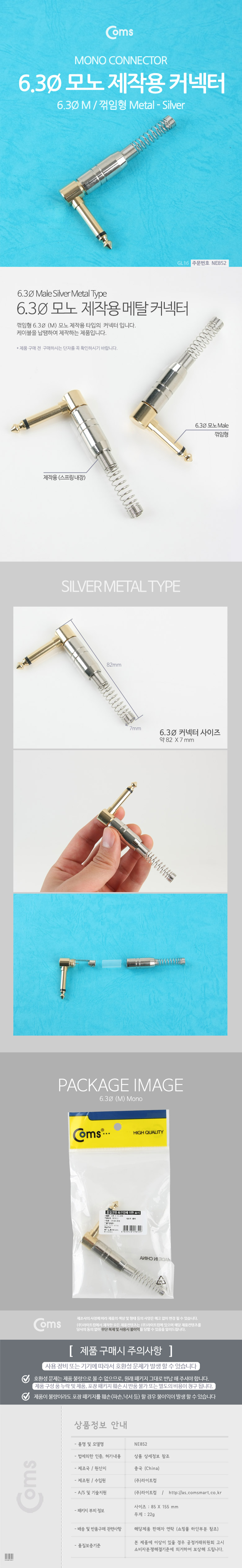 [Coms] 컴스 모노 6.3mm 커넥터 M NE852 (82x7mm/실버, 스프링, 메탈, 모노꺾임, 제작용)