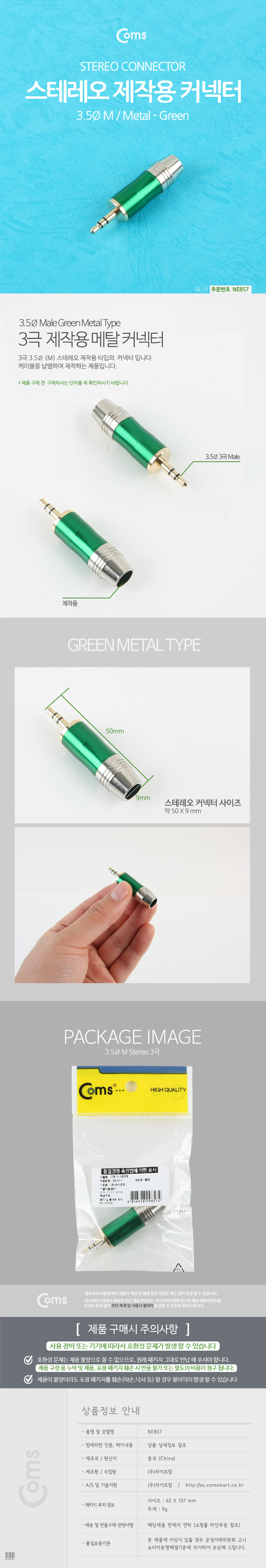 [Coms] 컴스 스테레오 3.5mm 3극 커넥터 M NE857 (9x50mm/그린, 메탈, 제작용)