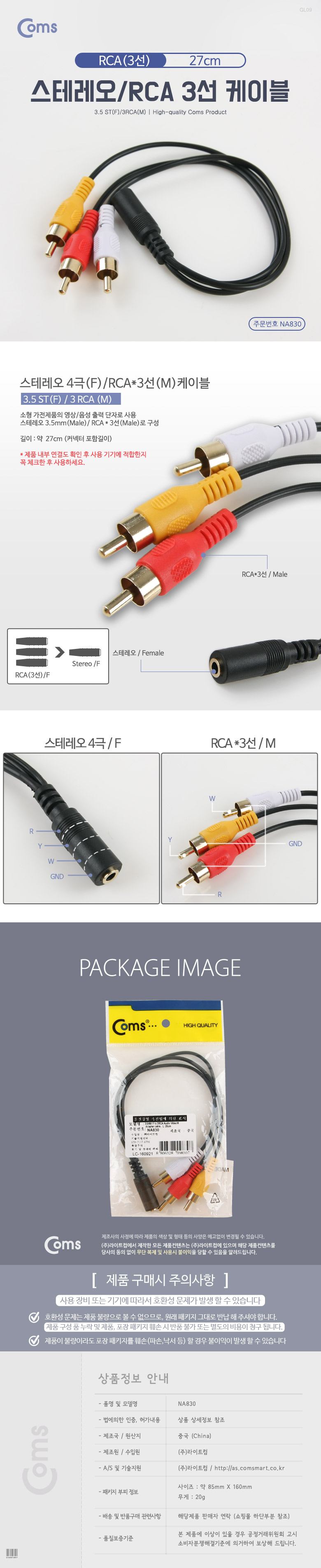 [Coms] 컴스 스테레오 3.5mm 4극/RCAx3 케이블 M/F NA830 (27cm/숏, 블랙)