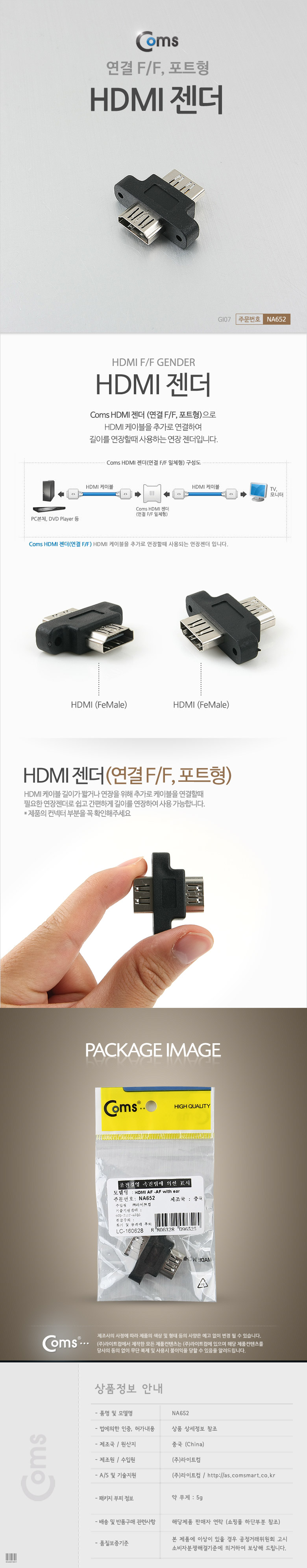 [Coms] 컴스 HDMI 연결 젠더 F/F NA652 (블랙, 포트형)