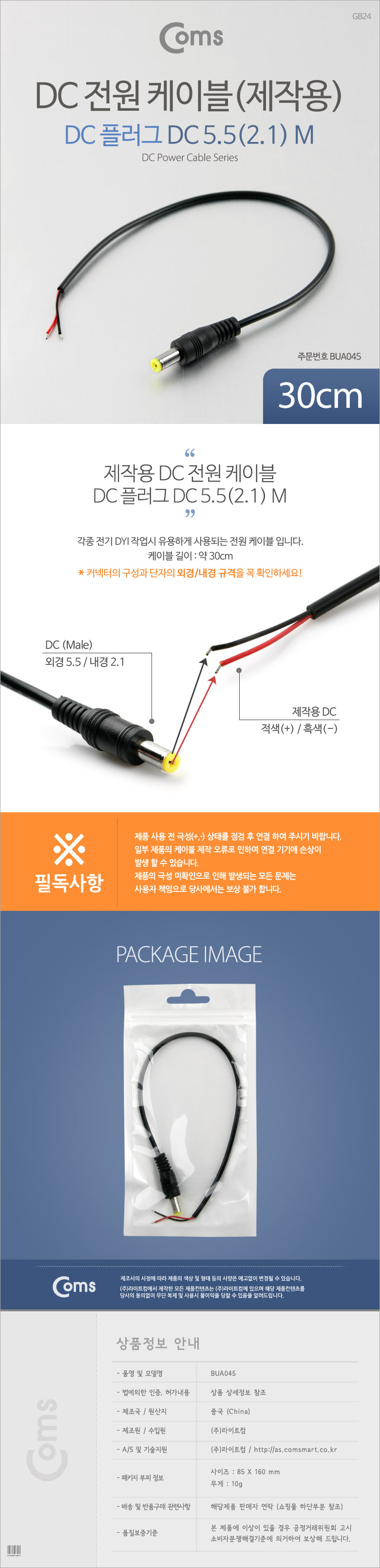 [Coms] 컴스 DC 5.5/2.1mm 전원 케이블 M BUA045 (30cm/블랙, DC 2선/제작용)