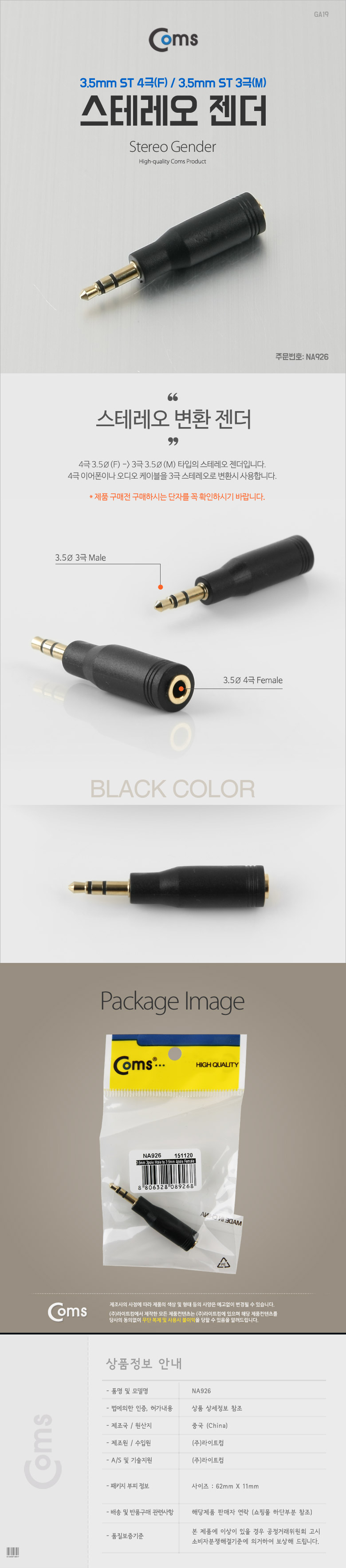 [Coms] 컴스 스테레오 3.5mm 4극 to 3극 젠더 F/M NA926 (62x11mm, 블랙, 컨넥터 골드)