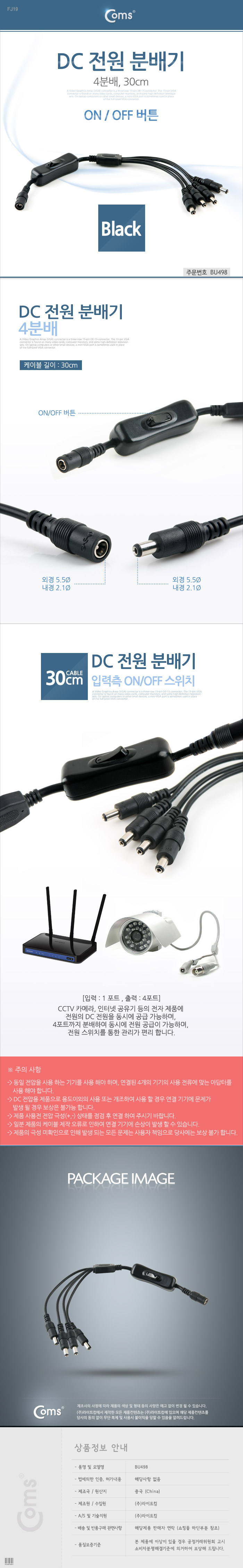 [Coms] 컴스 DC 5.5/2.1mm 전원 분배기 F/M BU498 (30cm/블랙, 통합On/Off, 4분배)