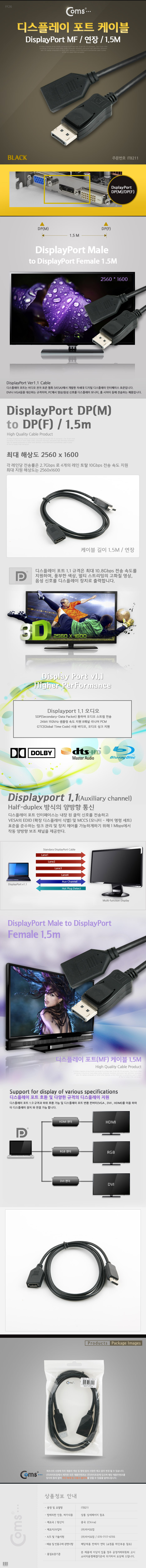 [Coms] 컴스 디스플레이 포트 1.1V 연장 케이블 M/F ITB211 (1.5m/블랙, 10Gbps)