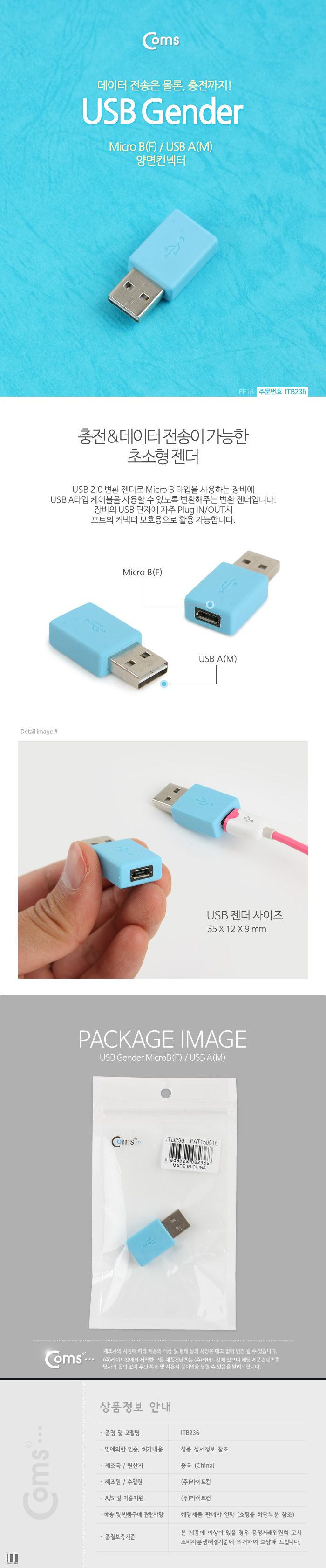 [Coms] 컴스 USB A/마이크로 B 젠더 M/F ITB236 (35x12x9mm, 스카이블루)