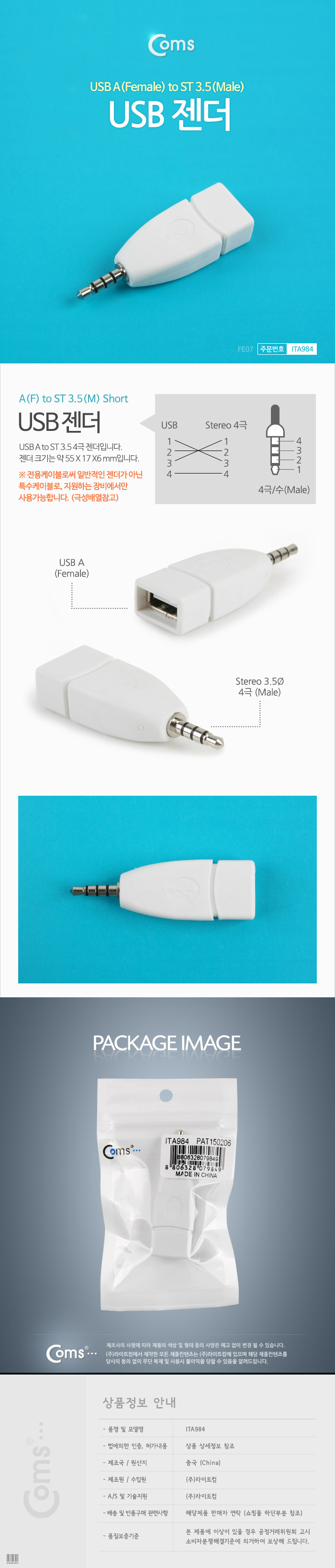 [Coms] 컴스 USB to 스테레오 3.5mm 4극 젠더 F/M ITA984 (화이트, 55x17x6mm)
