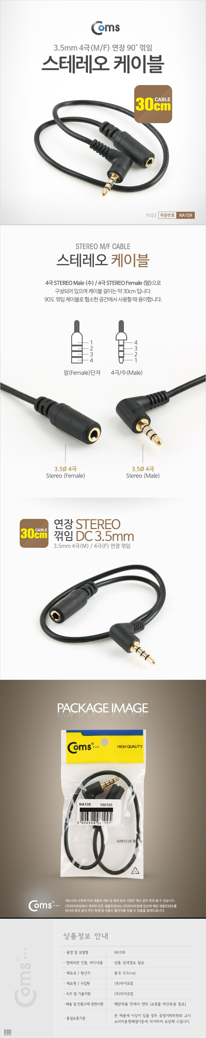 [Coms] 컴스 스테레오 3.5mm 4극 연장 케이블 M/F NA109 30cm (30cm/블랙, M꺾임)