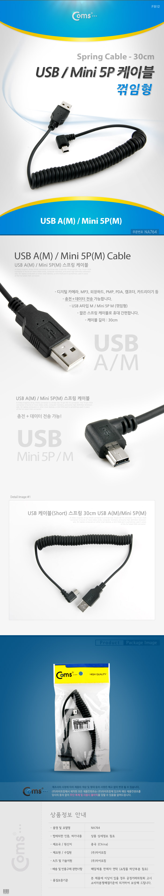 [Coms] 컴스 USB/미니 5핀 케이블 M/M NA764 (30cm/숏, 블랙, 미니5핀꺾임, 스프링, 데이터 전송/충전)
