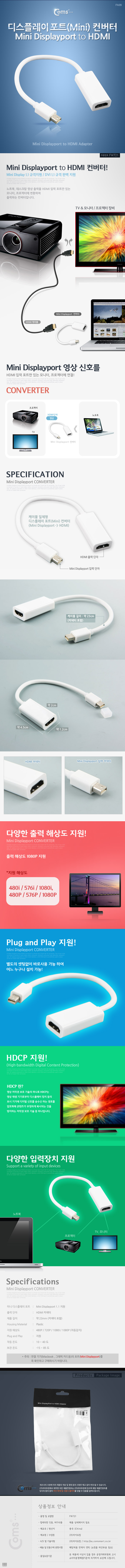 [Coms] 컴스 미니 디스플레이 포트 to HDMI 컨버터 FW721 (화이트, 케이블 일체형/23cm, 480/576/1080P)