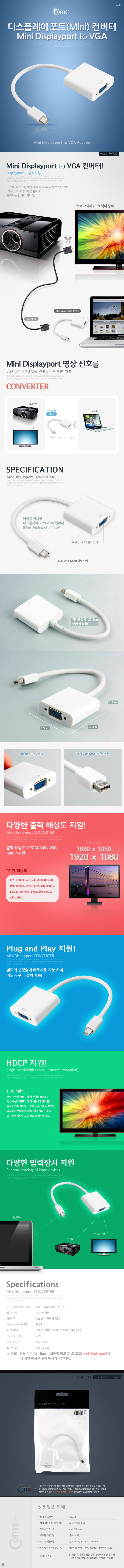 [Coms] 컴스 미니 디스플레이 포트 to VGA 15핀 컨버터 FW720 (화이트, 케이블 일체형/22.5cm, 1920x1080P)