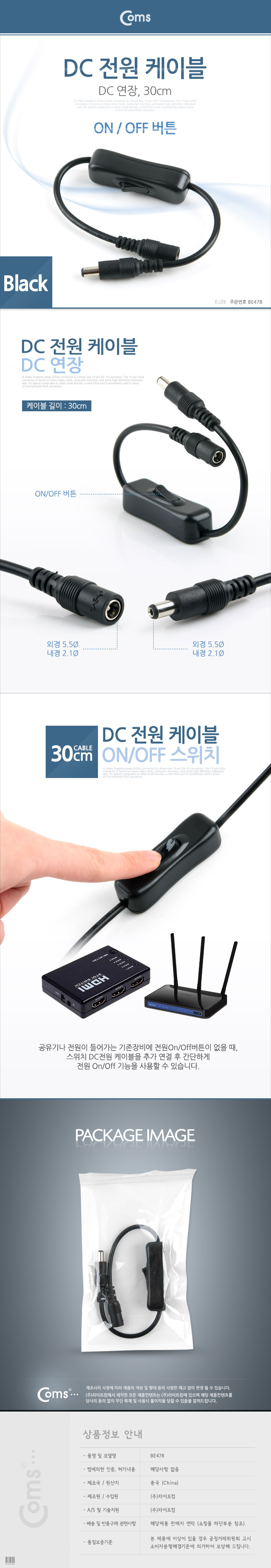 [Coms] 컴스 DC 5.5/2.1mm 전원 연장 케이블 M/F BE478 (30cm/블랙, ON/OFF)