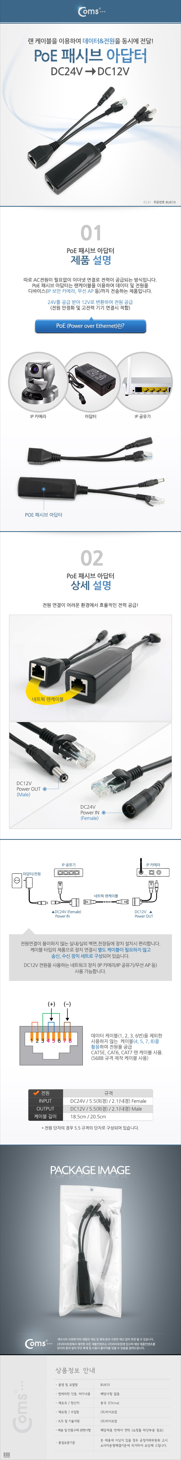 [Coms] 컴스 POE 패시브 아답터 F/M BU610 (18.5/20.5cm/블랙, DC 24V to DC 12V)