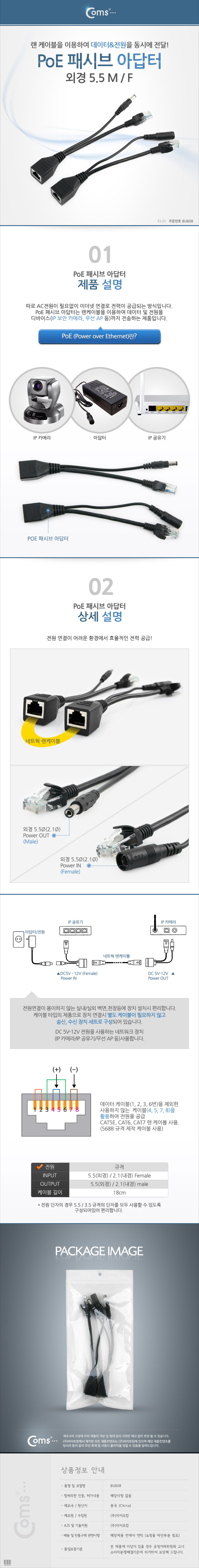 [Coms] 컴스 POE 패시브 아답터 M/F BU608 (18cm/블랙, DC 5/12V)