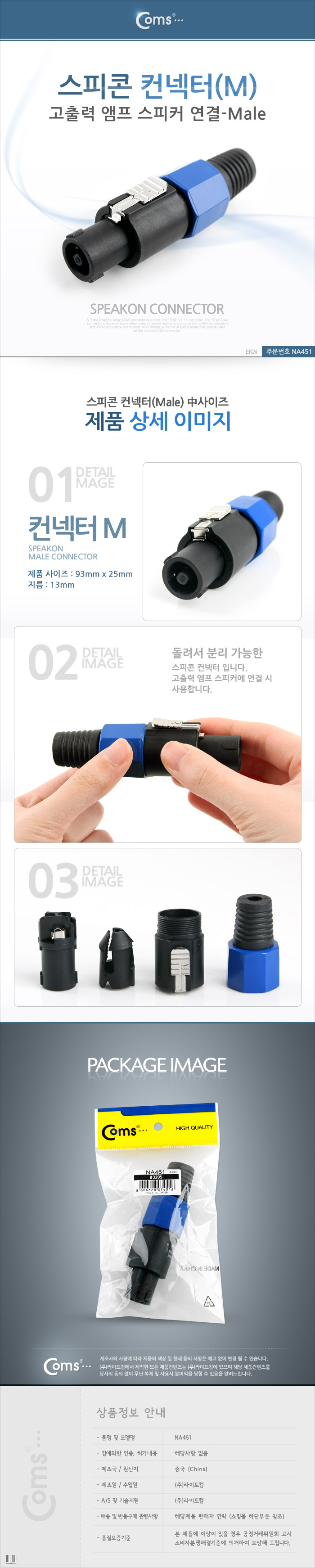 [Coms] 컴스 컨넥터 스피콘 컨넥터 M NA451 (93x25mm/대, 블루+블랙, 고출력, 앰프 스피커 연결)