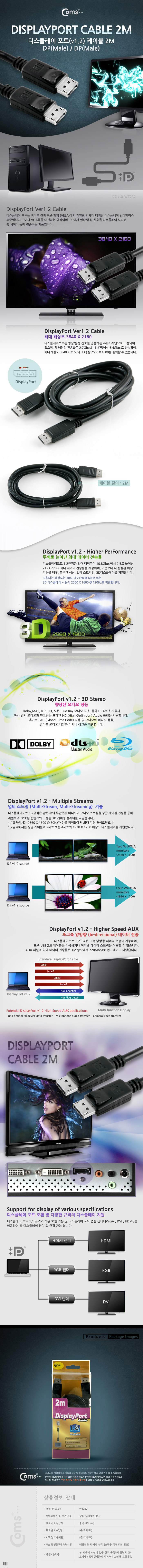 [Coms] 컴스 디스플레이 포트 1.2V 케이블 M/M WT232 (2m, 블랙, 해상도3840x2160)